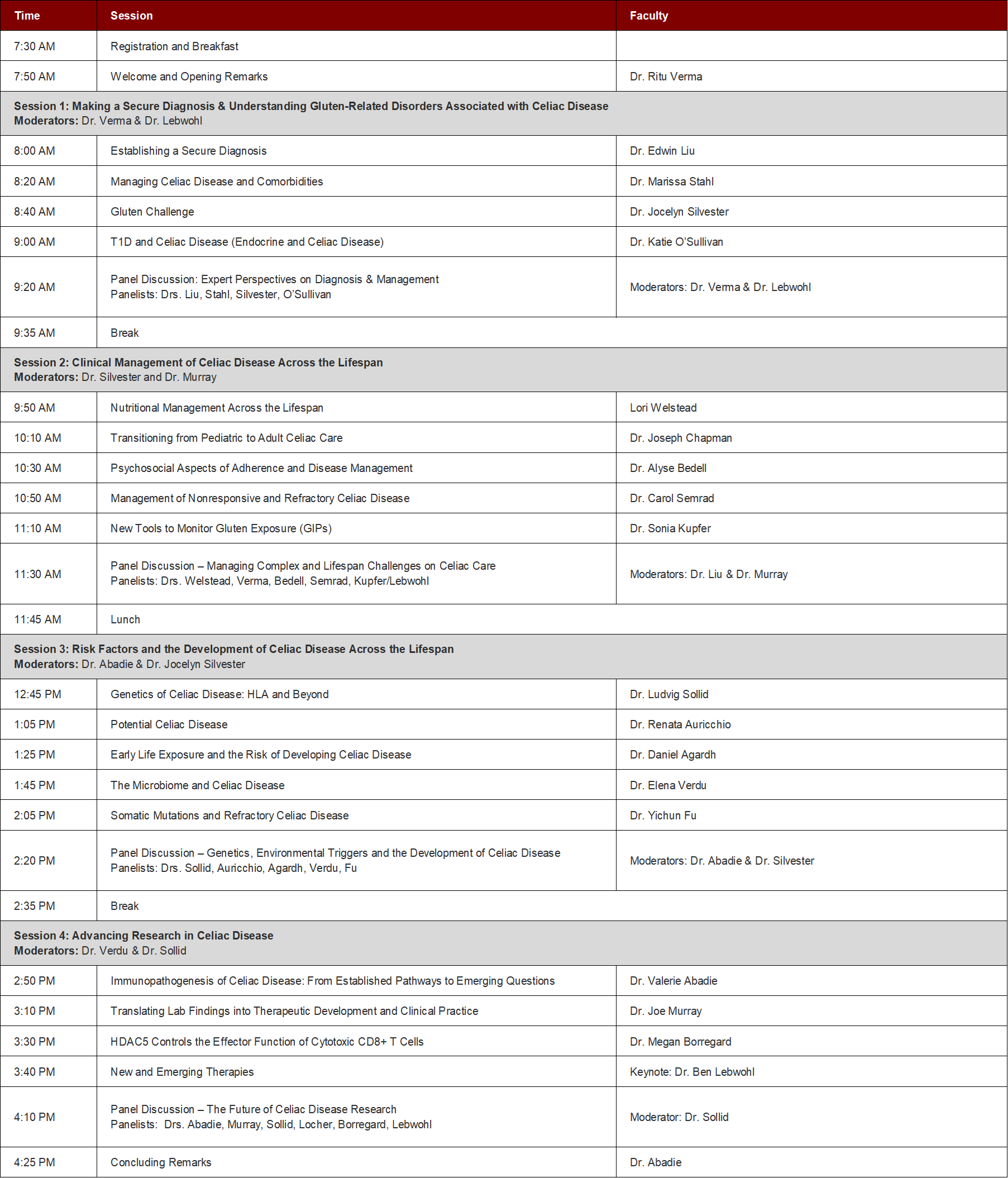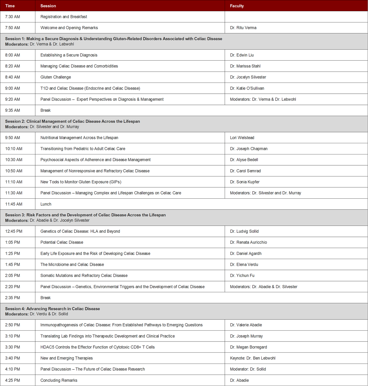 Attend this full-day symposium where top national and international experts will share the latest breakthroughs in celiac disease care and science. The agenda delivers high-impact, clinically relevant, and research-focused content covering advanced diagnostic protocols, screening and risk assessment, best practices for lifelong patient management and transitioning care, strategies for optimizing dietary adherence, and treating refractory celiac disease.